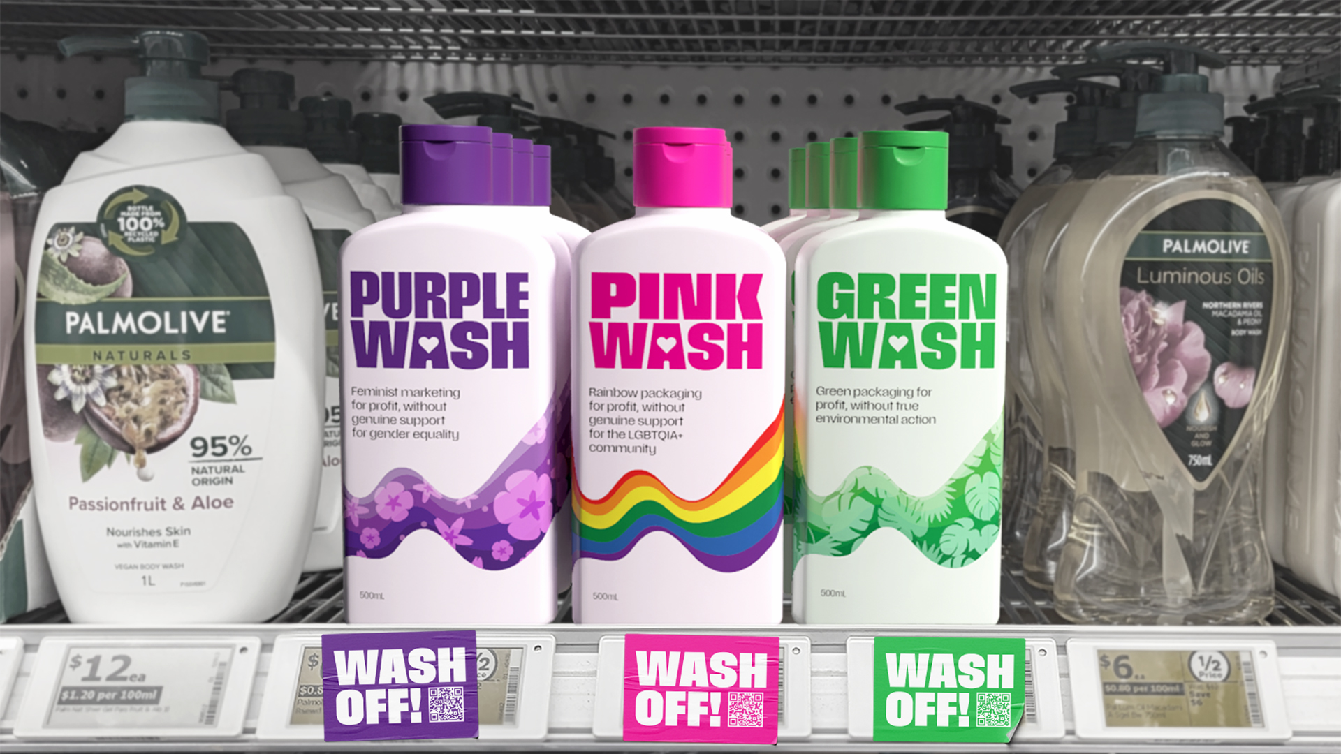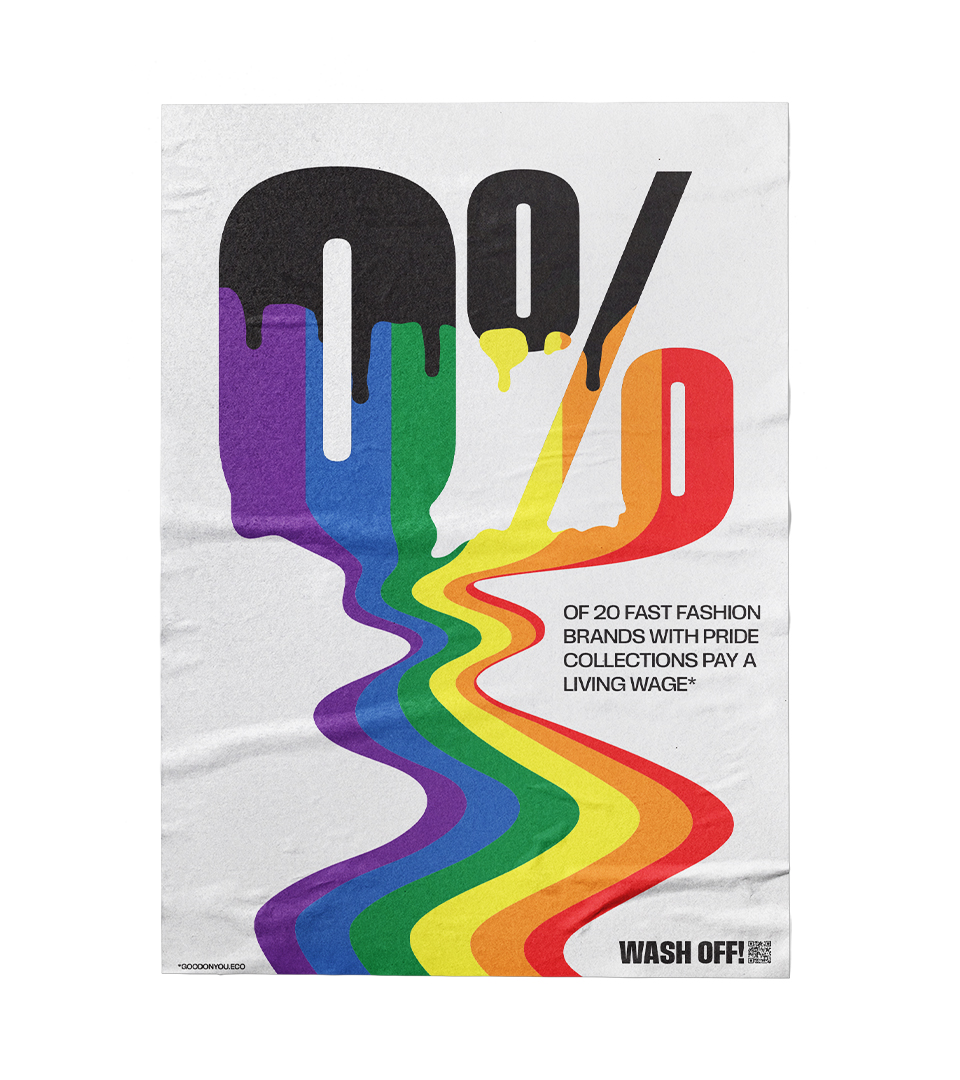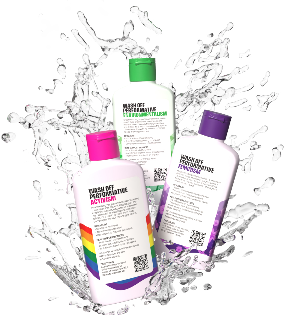 WASH OFF exposes performative activism like pinkwashing, greenwashing, and purplewashing with bold visuals and striking statistics. Vibrant graphics, sometimes dripping to reveal harsh truths, paired with concise copy, inspire accountability. This campaign sparked conversations, showcasing design's power to uncover hidden truths and challenge brands to move beyond superficial activism.