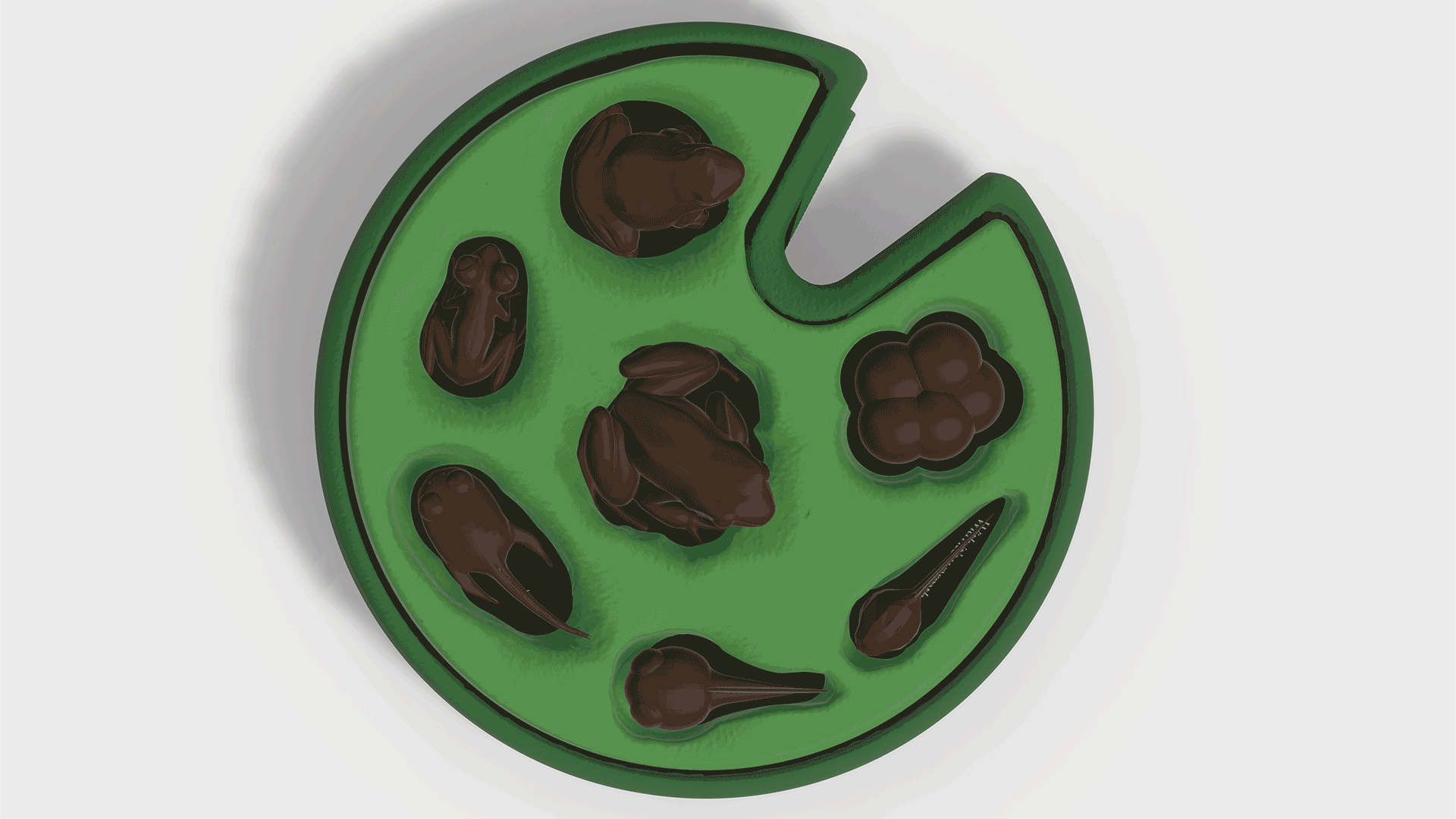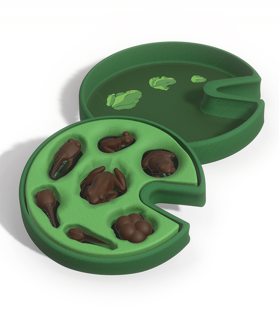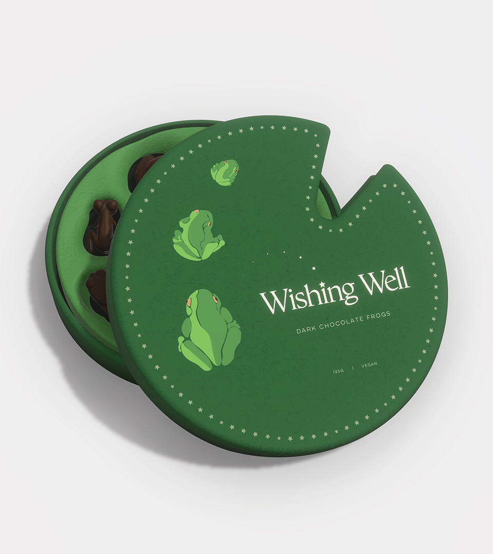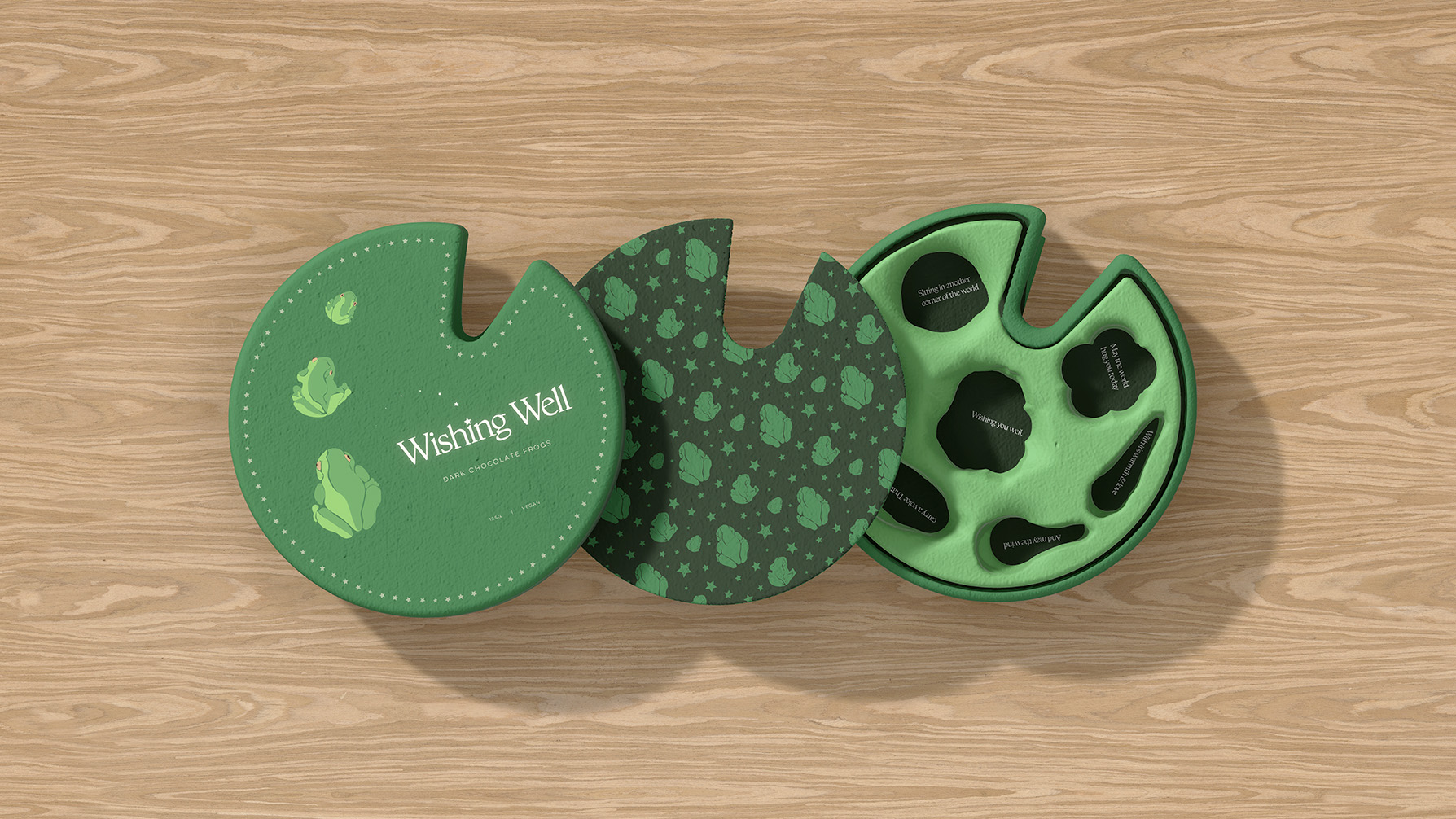 Wishing Well transforms packaging into emotional storytelling. Inspired by childhood memories with my pop, the lily pad-shaped chocolate box celebrates a frog’s life cycle and themes of love, generosity, and discovery. Lines of a poem are revealed as each chocolate is removed, creating a deeply meaningful and immersive gift-giving experience.