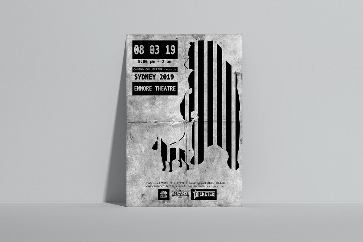 Design directly inspired by French music techno collective. Logo illustration, poster and album cover designed with minimalist approach and restricted palette.