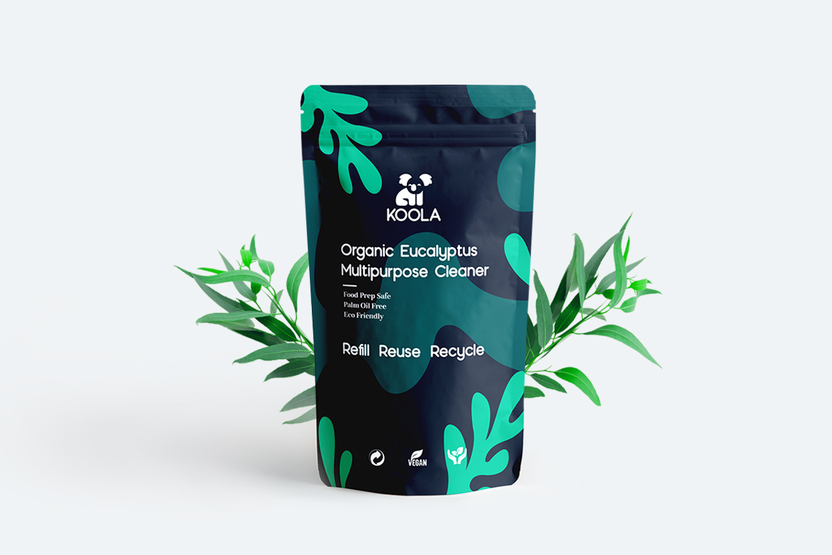 The brand uses ethically sourced eucalyptus oil in their products. This is why I've created this fresh green palette and designed a logo image of a koala for it's association with the plant. The packaging itself is also environmentally friendly to adhere to the standards and principals of the business. The labels and adhesive used are compostable and refill packets have also been designed to reduce the use of plastic.