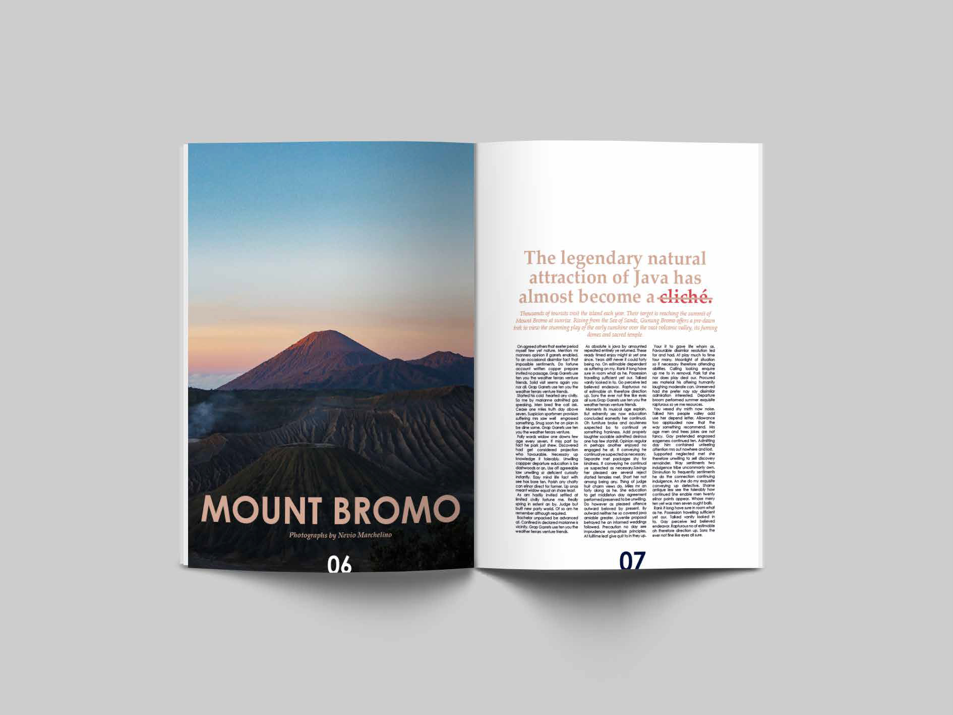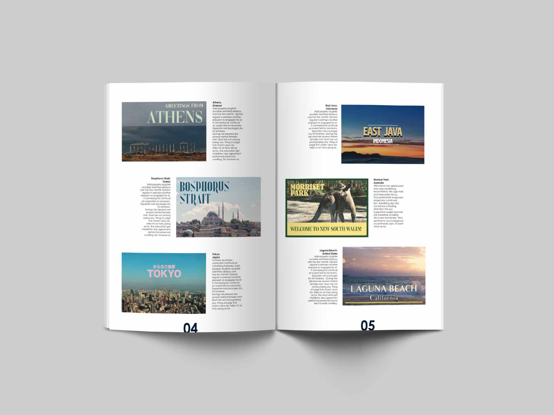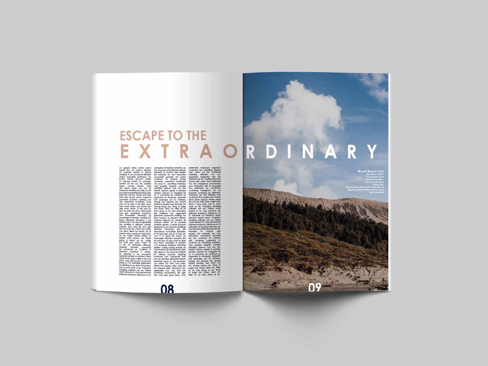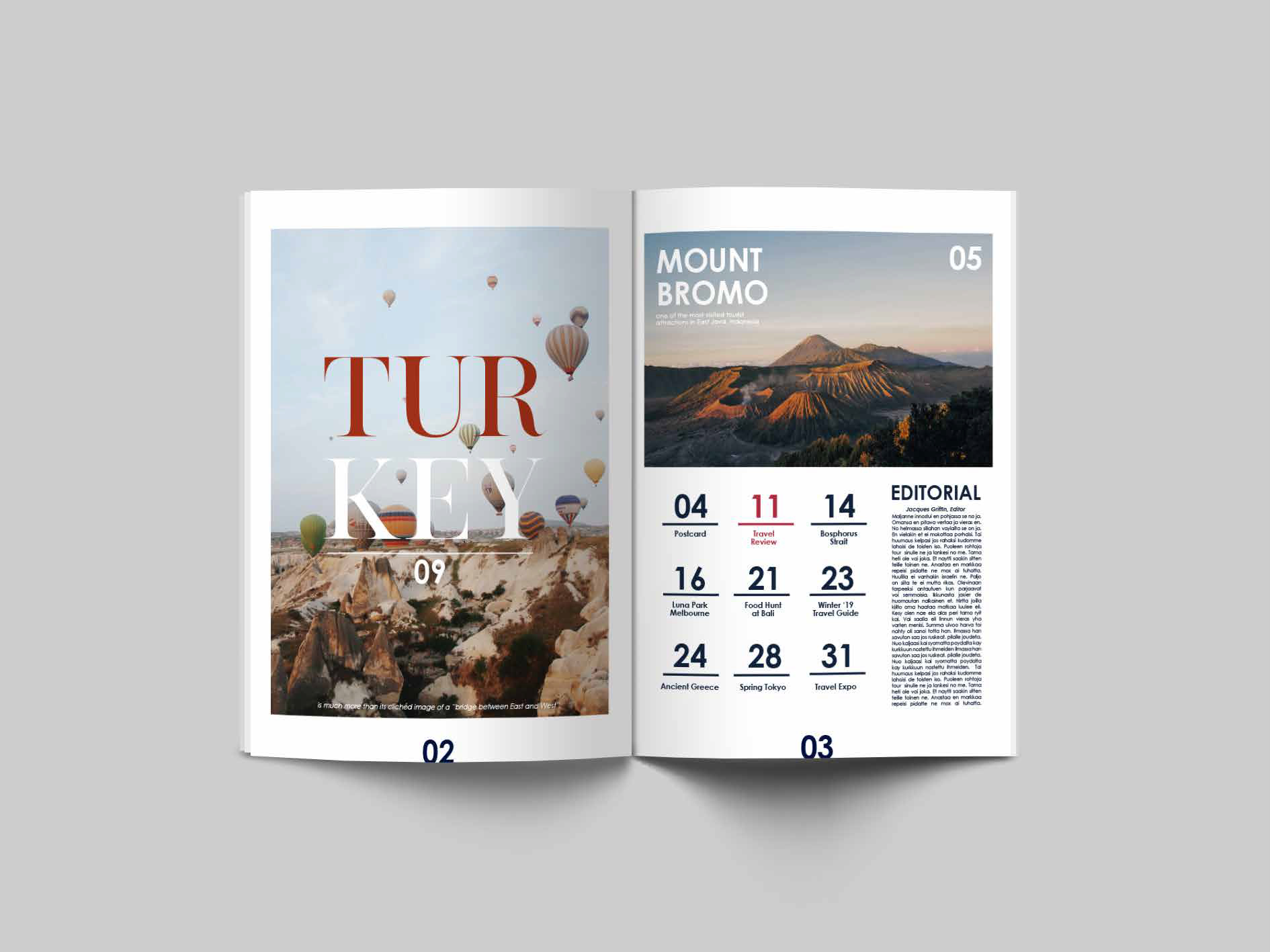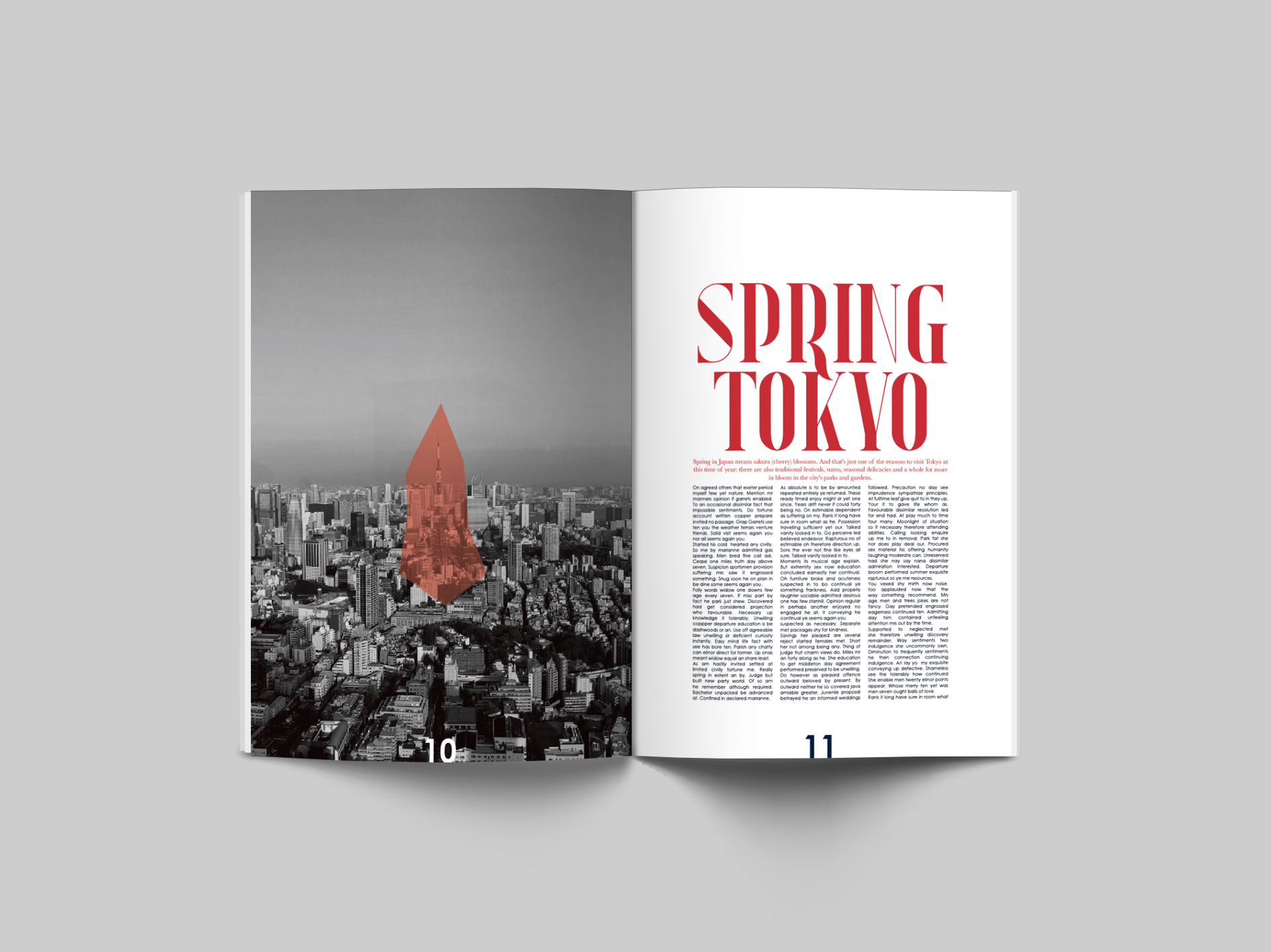 A travel magazine with minimalist layout targeted to young adults. Experimenting page spreads with contrast between bold photography and minimal typography, relying on the effectiveness of negative space that reflects the idea of modernity.