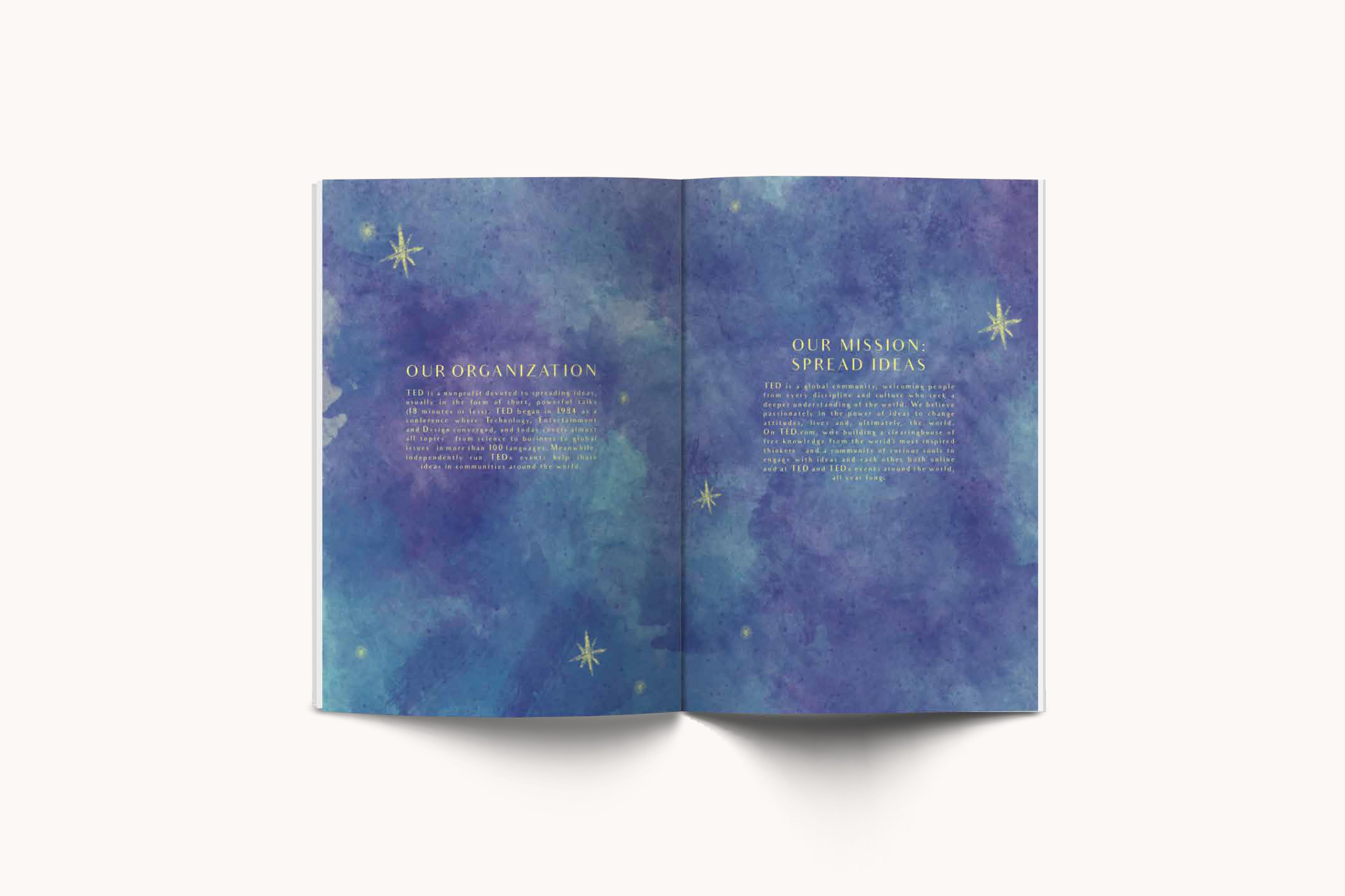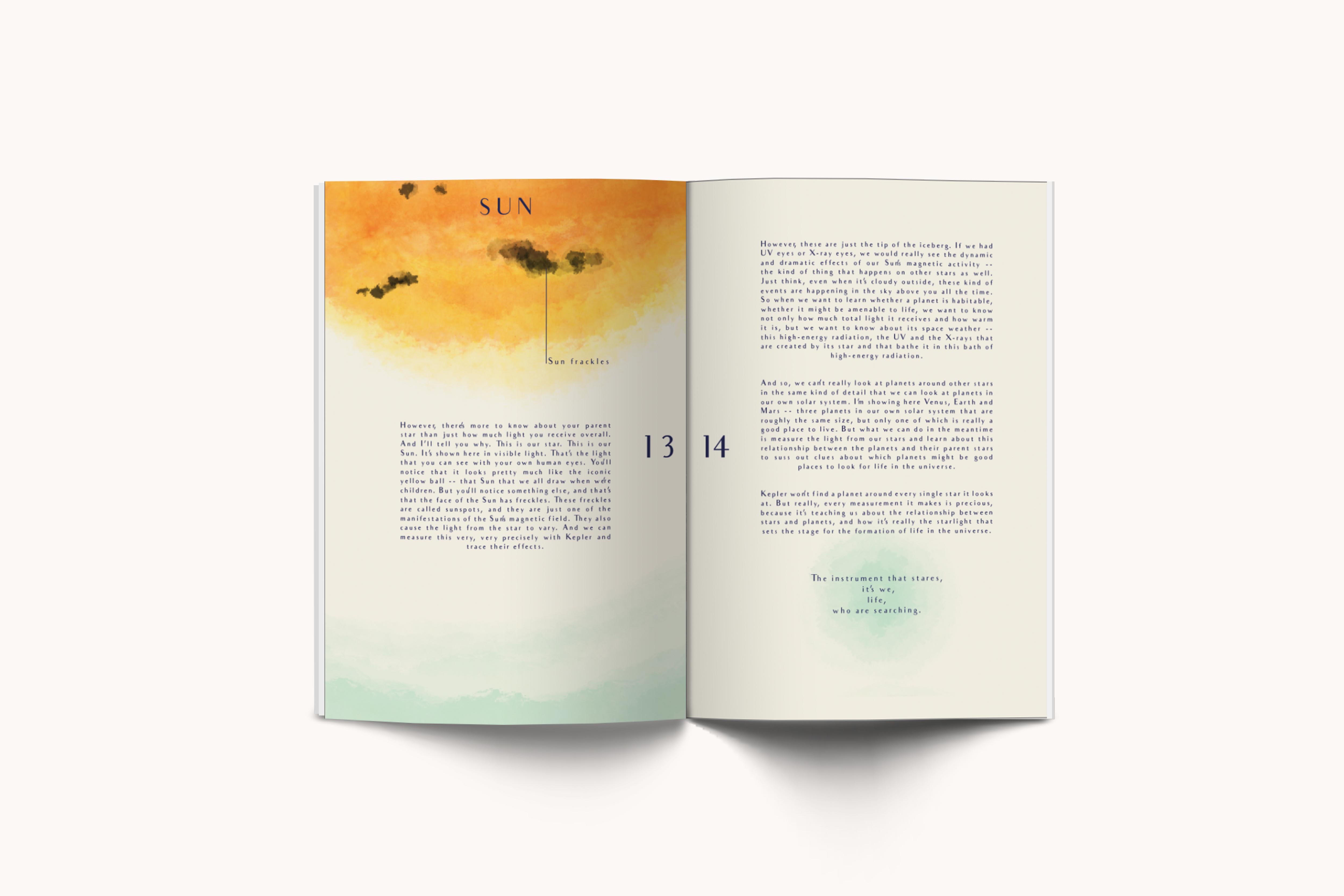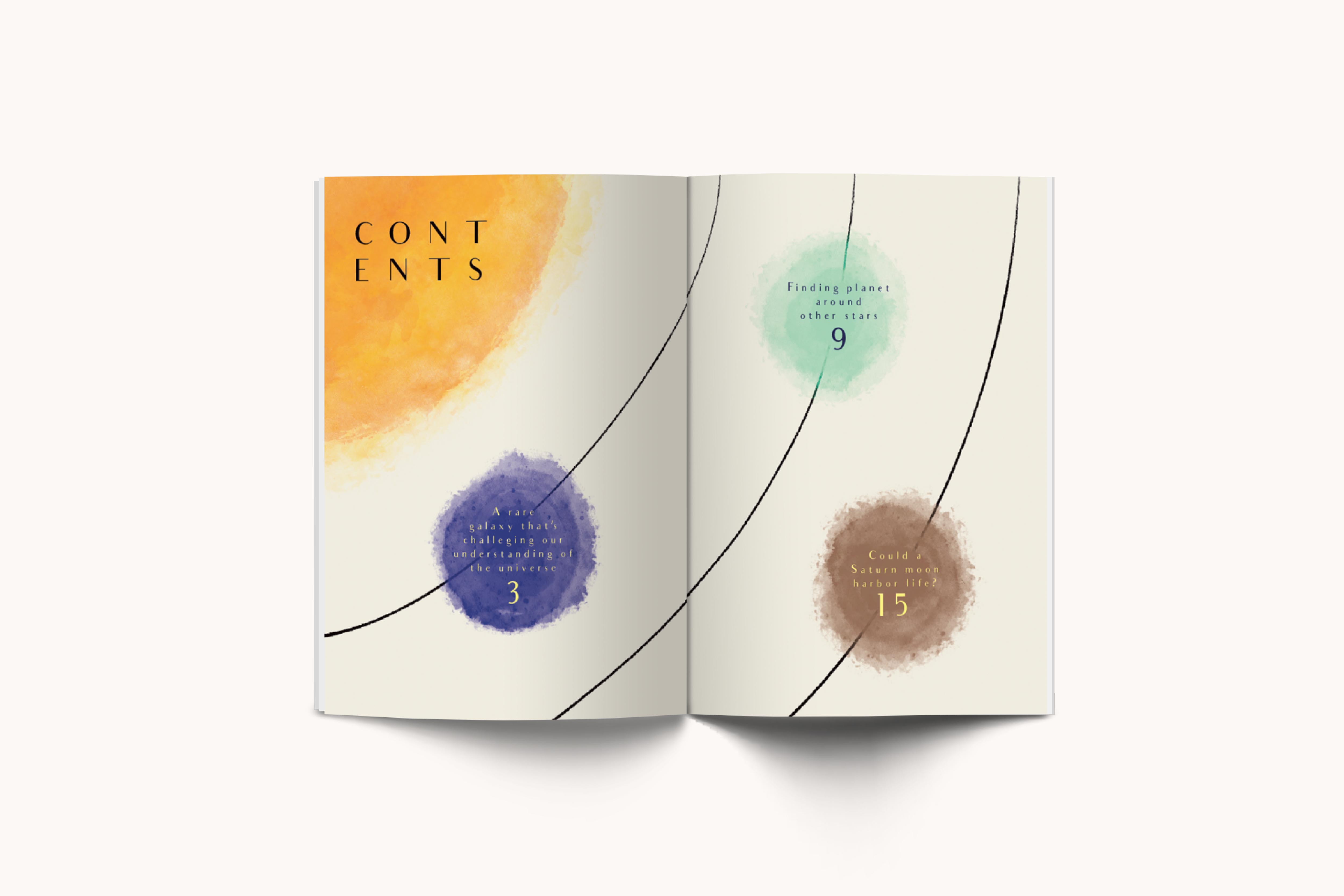 Space themed booklet with a bold rustic approach. Typography, watercolour illustration and pastel palette unite to create an enjoyable booklet for the viewer. Each chapter is represented by different pastel colours that are colour coded on the contents page.