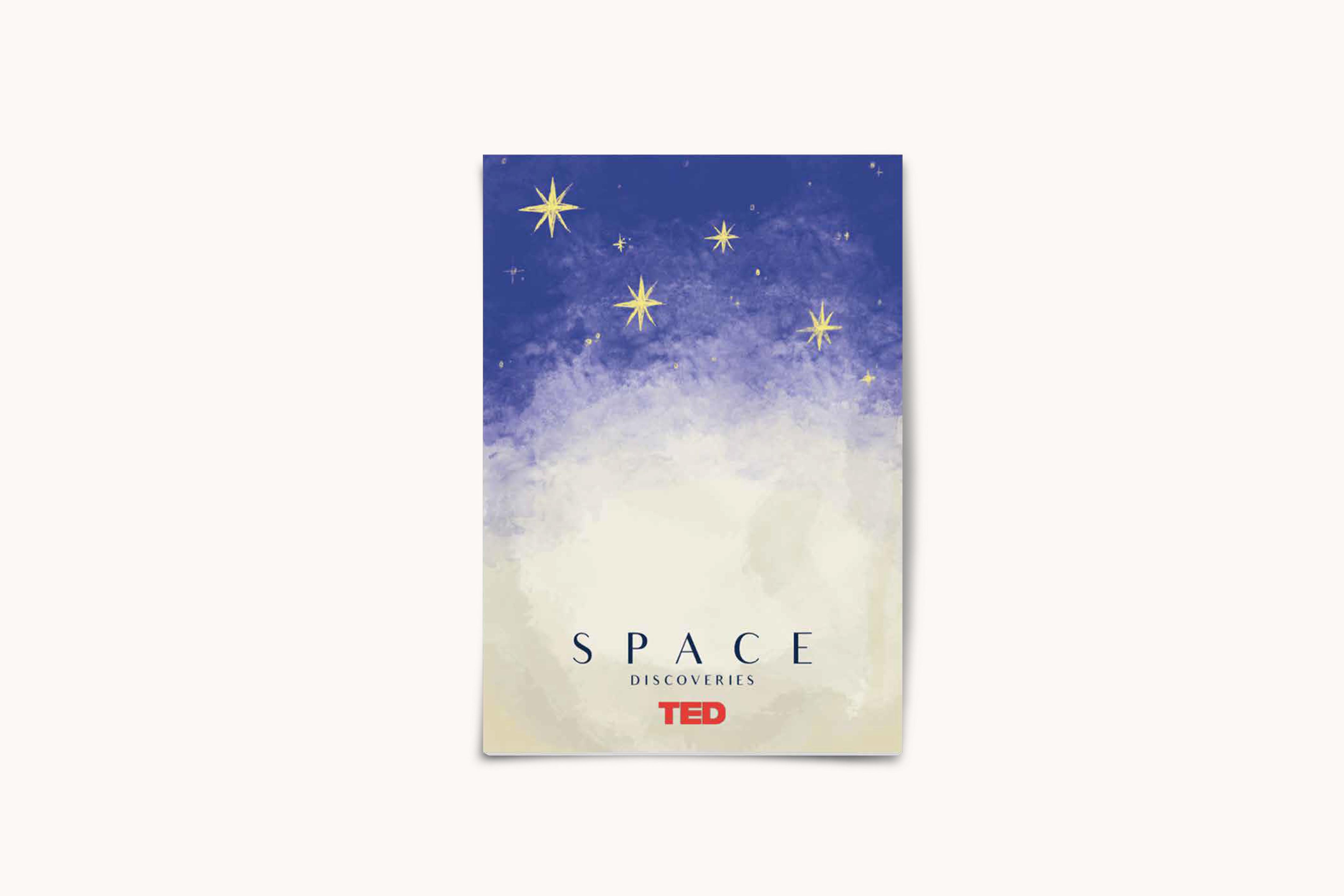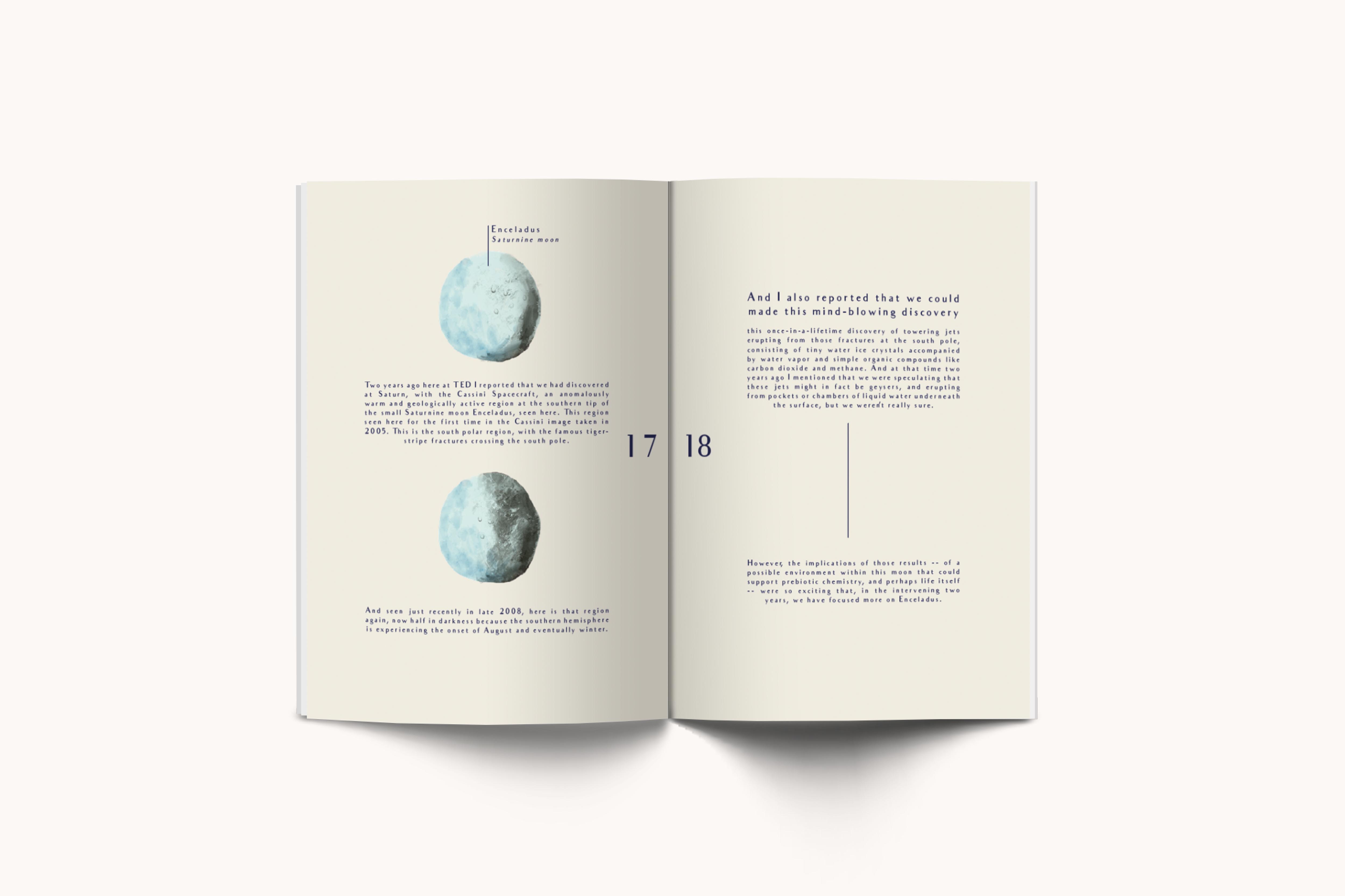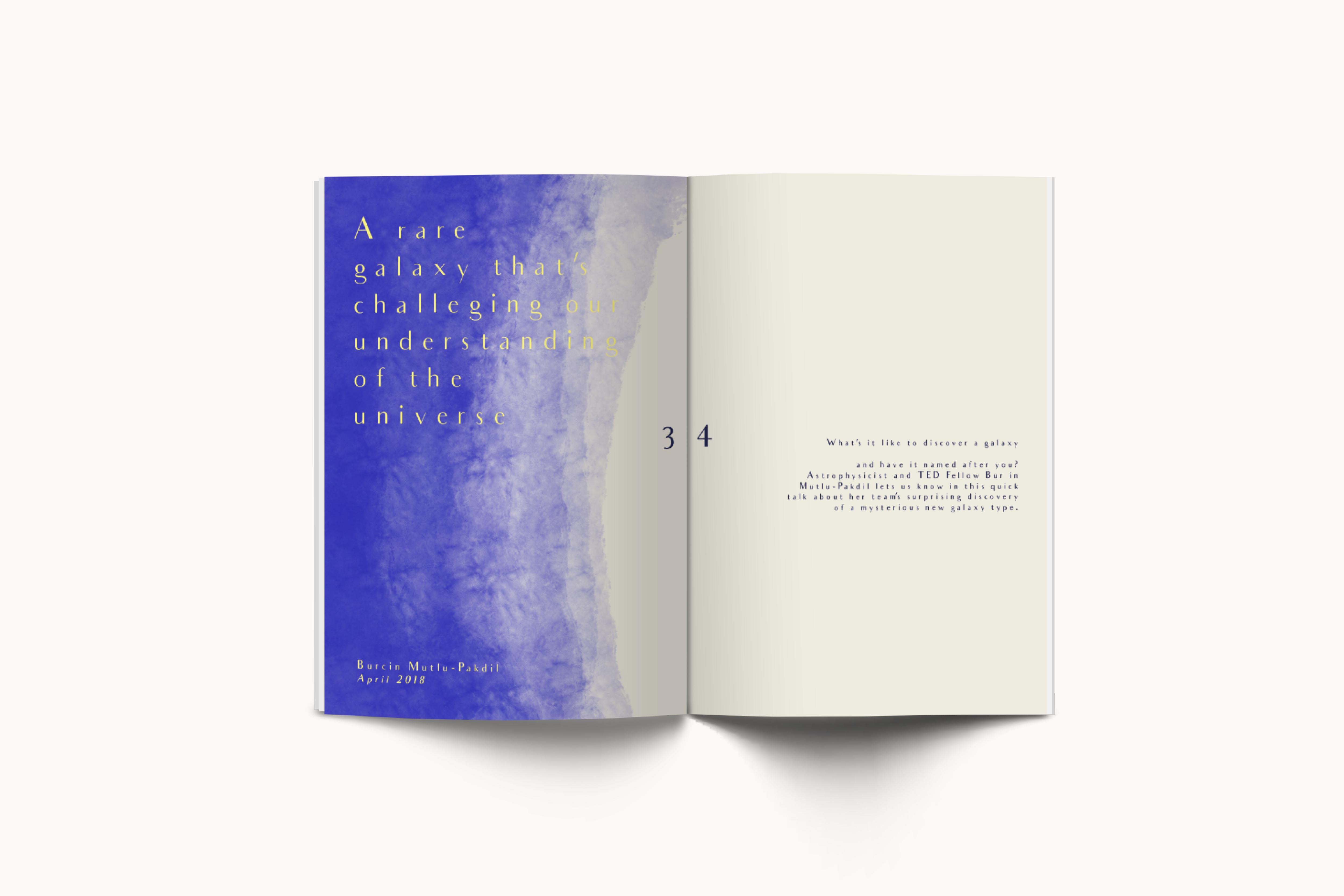 Space themed booklet with a bold rustic approach. Typography, watercolour illustration and pastel palette unite to create an enjoyable booklet for the viewer. Each chapter is represented by different pastel colours that are colour coded on the contents page.